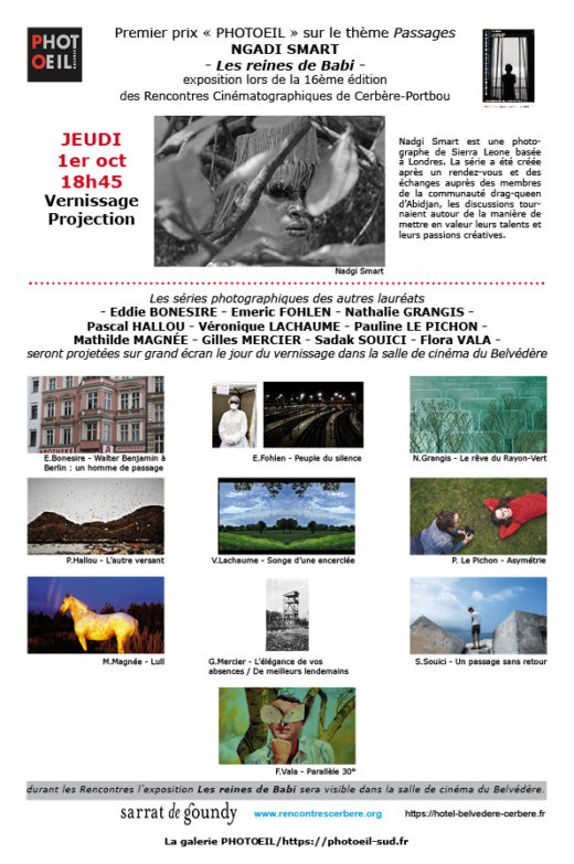Les lauréats 2020 pour la photographie dans la 16ème édition des Rencontres Cinématographiques de Cerbère-Portbou, du 1er au 4 oct Vernissage, exposition, projection, le jeudi 1er octobre 2020 à 18h45 Ngadi SMART est une photographeLire la suite…